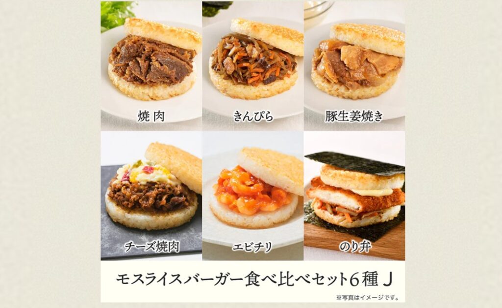 ちなみに、冒頭の画像は、モスバーガーの「オンラインショップ(ライスバーガー専門店)」内の、「モスライスバーガー食べ比べ6種J〈のり弁・焼肉・きんぴら・豚生姜焼き・エビチリ・チーズ焼肉〉」のページから引用したものです。