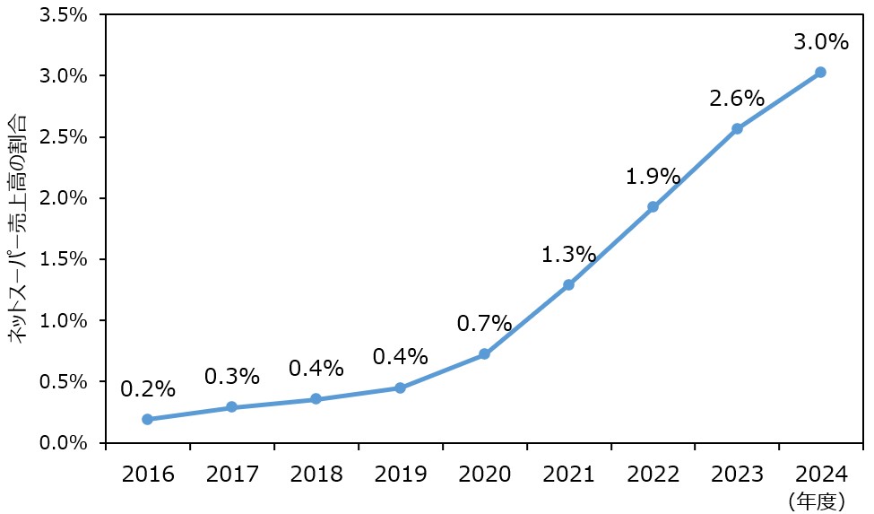 全社売上に占める、ネットスーパー事業の売上高の割合は、2024年度に3%に達しました。