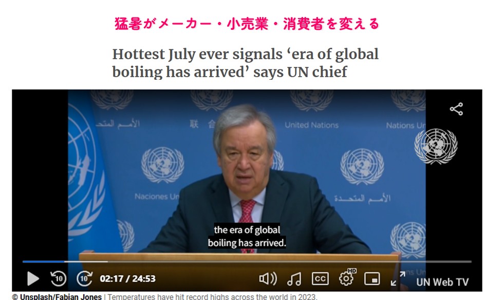 冒頭の画像は、2023年7月に国連のグテーレス事務総長が「地球温暖化時代が終わり、地球沸騰化時代が始まった」と語った会見の様子です(画像出所:UN News (United Nations) “Hottest July ever signals ‘era of global boiling has arrived’”)。