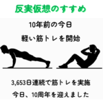 - 【コラム】やっていなかった場合の自分と比較する「反実仮想」のすすめ――祝!筋トレ継続10周年本日、2026年3月27日は、私にとって、大きな節目となりました。 10年前の今日、2016年3月27日に始め… 続きを読む: 【コラム】やっていなかった場合の自分と比較する「反実仮想」のすすめ――祝!筋トレ継続10周年